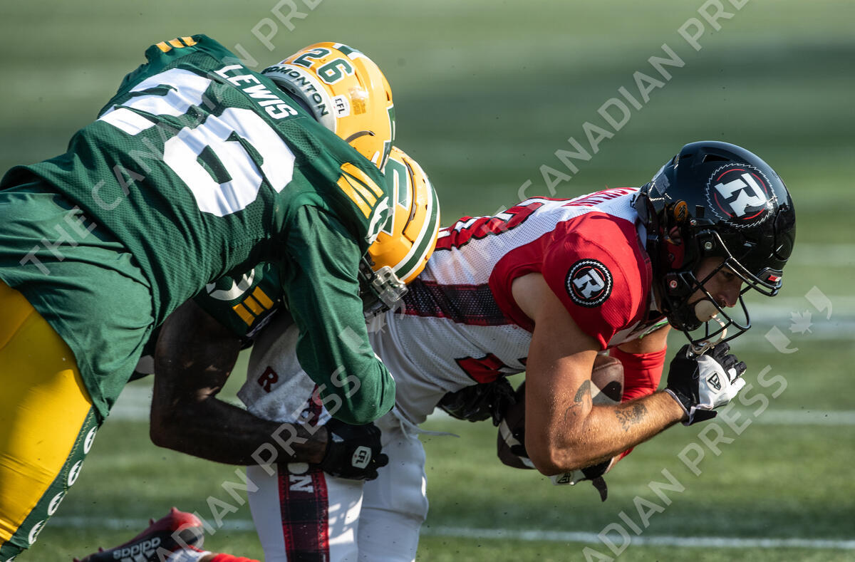 Ottawa Red Blacks' Jaelon Acklin (23) is tackled by Edmonton Elks' Marcus Lewis (26) during first half CFL action in Edmonton, Alta., on Sunday August 27, 2023. THE CANADIAN PRESS/Jason Franson.