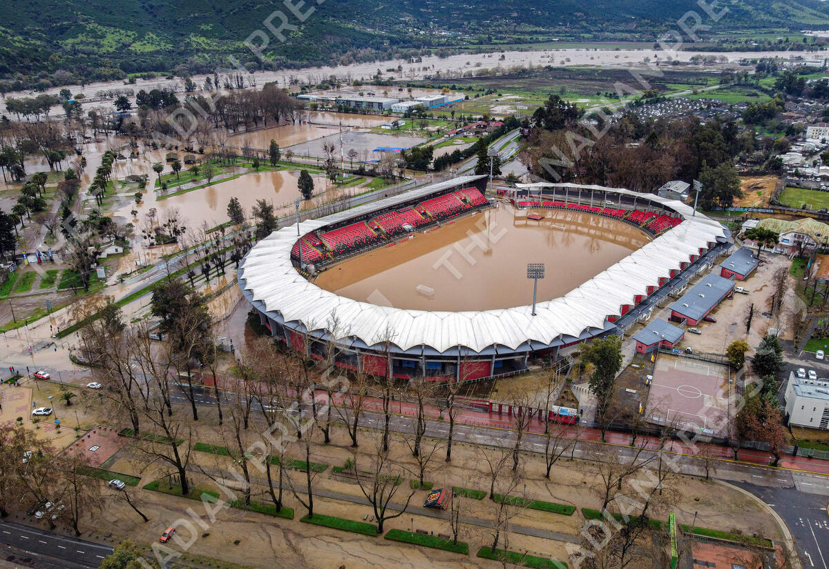 Fiscal de Talca stadium is flooded after the Rio Claro river overflowed during heavy rain in Talca, Chile, Tuesday, Aug. 22, 2023. Chilean government decreed on Tuesday an agricultural emergency in affected regions. (Jose Robles, Aton Chile via AP)
