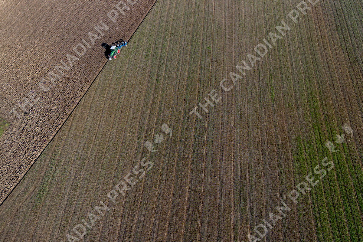 A farmer works on fields in Neu Anspach near Frankfurt, Germany, Saturday, Aug. 26, 2023. (AP Photo/Michael Probst)