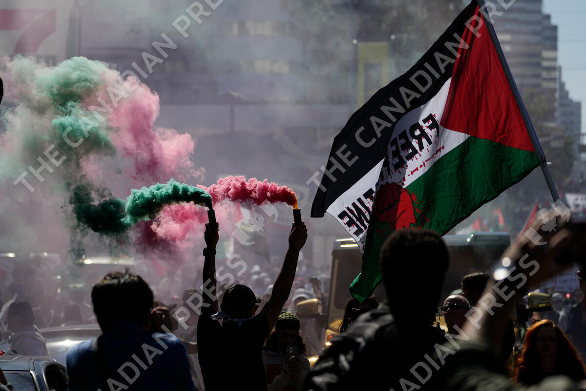 Demonstrators march in support of Palestinians, Saturday, Oct. 14, 2023, in Los Angeles. (AP Photo/Damian Dovarganes)
