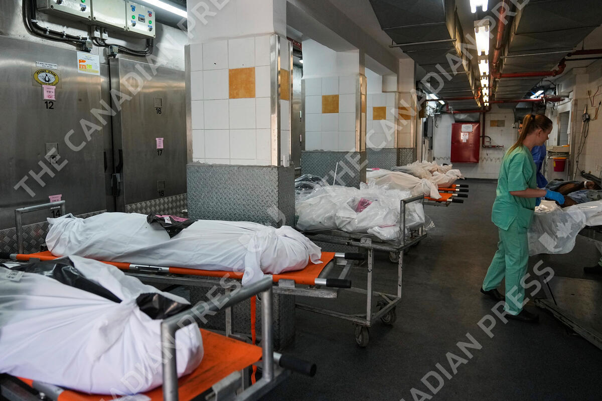 Forensic experts stand next to the bodies of Israelis killed by Hamas militants in the National Center for Forensic Medicine in Tel Aviv, Israel, Wednesday, Oct. 18, 2023. (AP Photo/Ohad Zwigenberg)