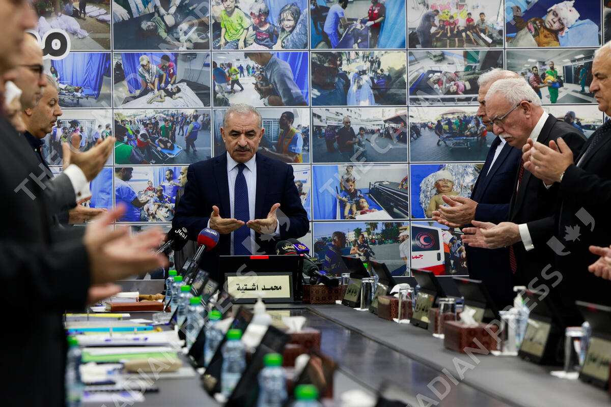 Palestinian Prime Minister Mohammad Shtayyeh, center, and members of his cabinet pray for the victims killed during the latest Israel-Hamas war, at the start of a cabinet meeting in the West Bank city of Ramallah, Monday, Oct. 16, 2023. (Jaafar Ashtiyeh/Pool Photo via AP)