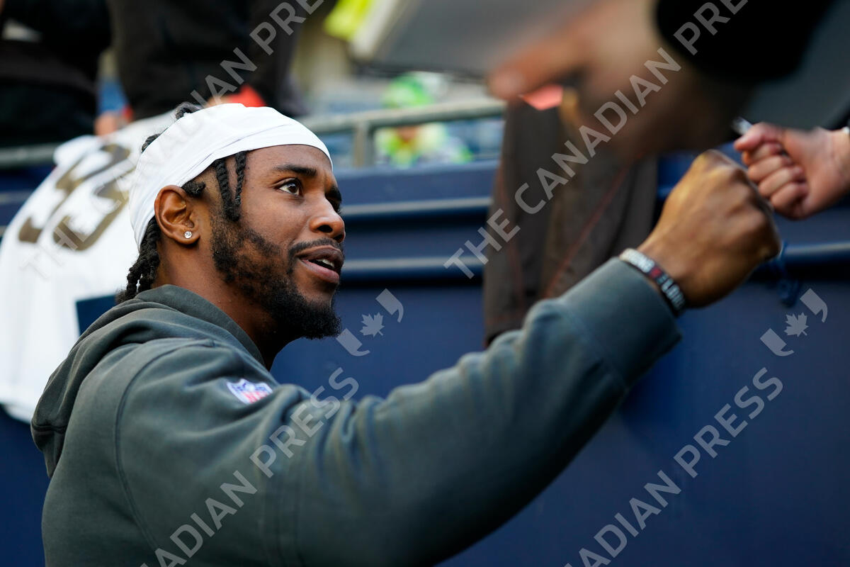Cleveland Browns wide receiver Donovan Peoples-Jones signs autographs for fans before an NFL football game against the Seattle Seahawks, Sunday, Oct. 29, 2023, in Seattle. The Seahawks won 24-20. (AP Photo/Lindsey Wasson)