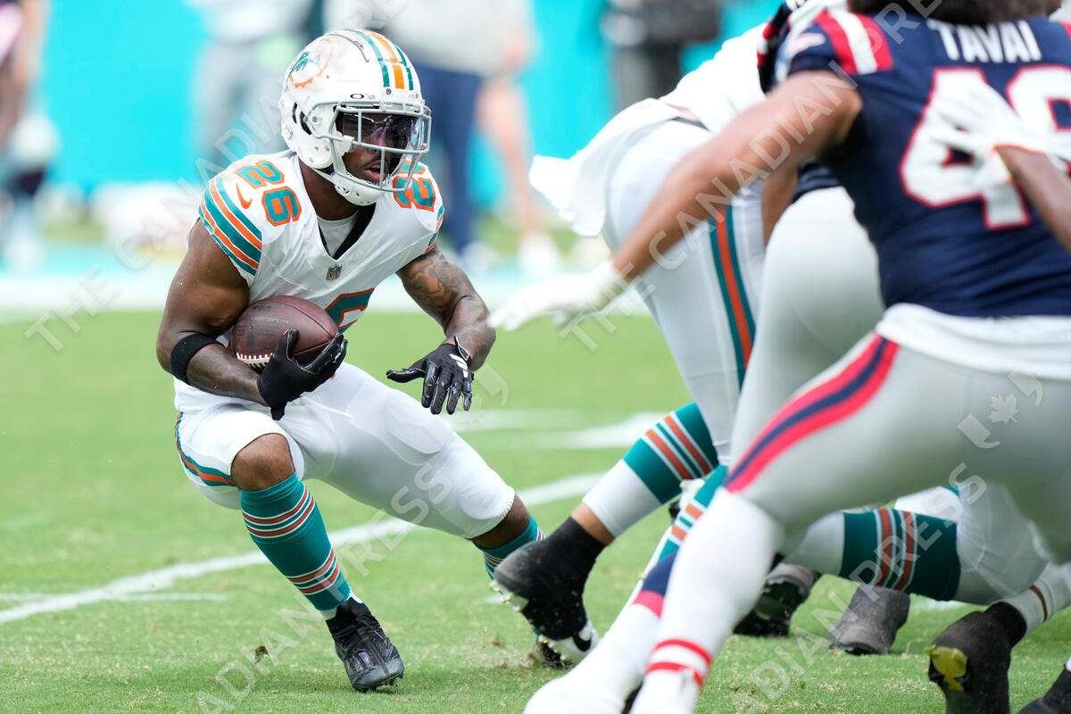 Miami Dolphins running back Salvon Ahmed runs for yardage during the first half of an NFL football game against the New England Patriots, Sunday, Oct. 29, 2023, in Miami Gardens, Fla. (AP Photo/Wilfredo Lee)