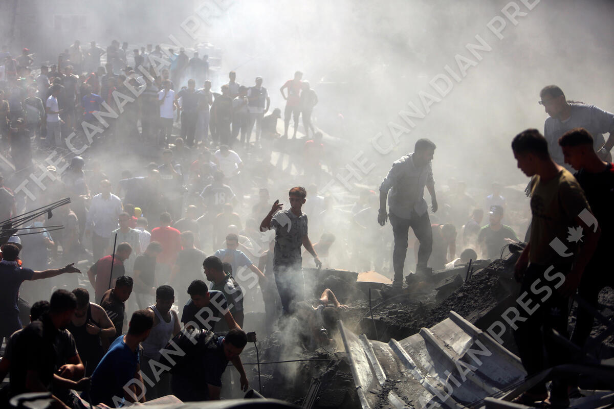 Palestinians inspect the rubble of destroyed buildings following Israeli airstrikes on the town of Khan Younis, southern Gaza Strip, Thursday, Oct. 26, 2023. (AP Photo/Mohammed Dahman)