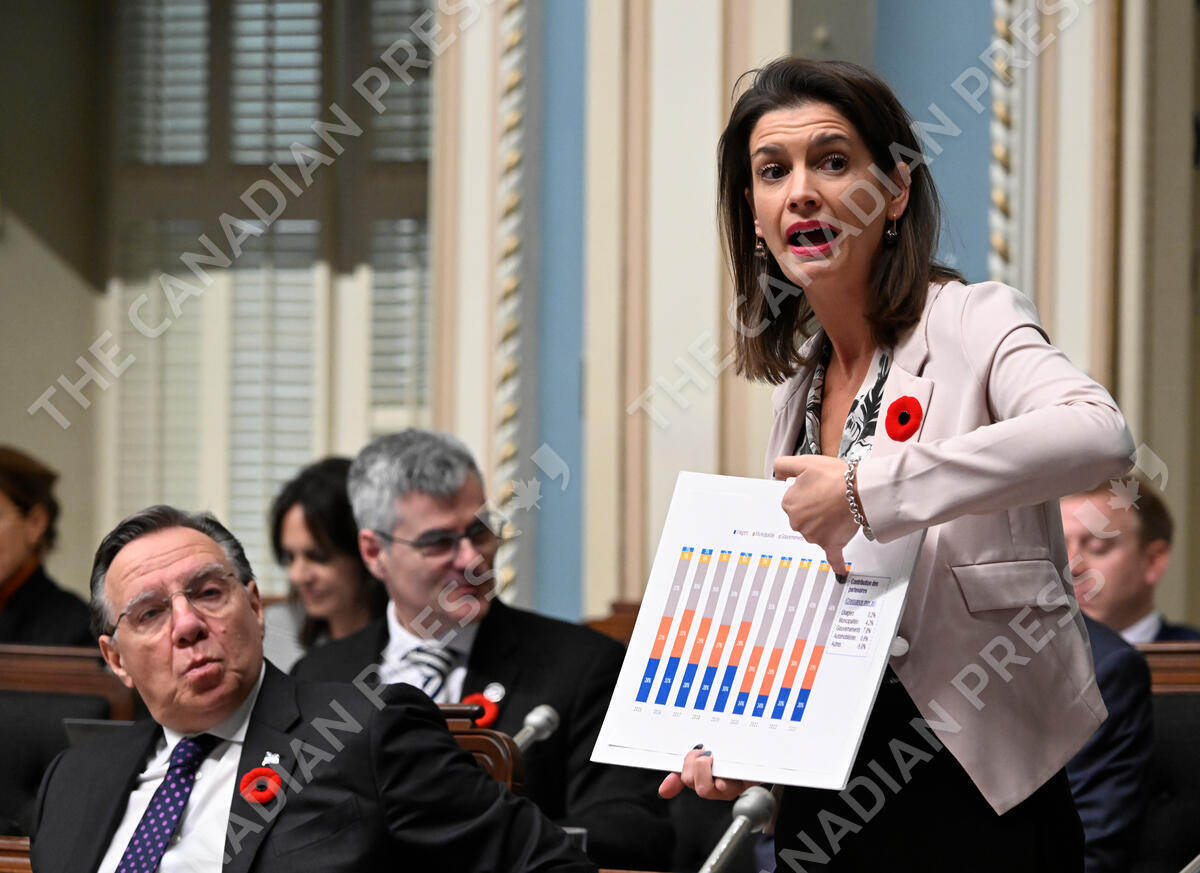 Quebec Deputy premier and Transport Minister Genevieve Guilbault responds to the Opposition during question period, at the legislature in Quebec City, Tuesday, Oct. 31, 2023. Quebec Premier Francois Legault, left, looks on. THE CANADIAN PRESS/Jacques Boissinot