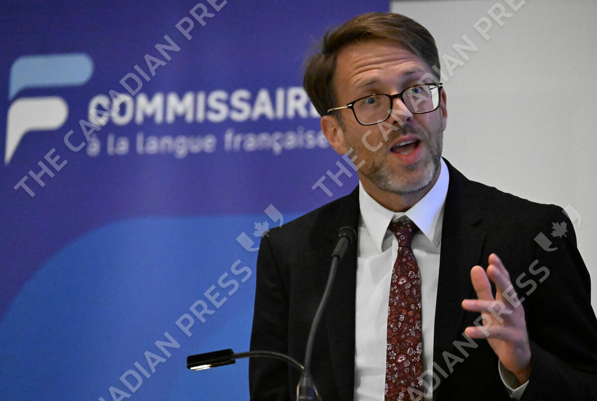 Benoit Dubreuil, commissary to the French Language, presents his first report at a news conference, at the legislature in Quebec City, Tuesday, Oct. 31, 2023. THE CANADIAN PRESS/Jacques Boissinot