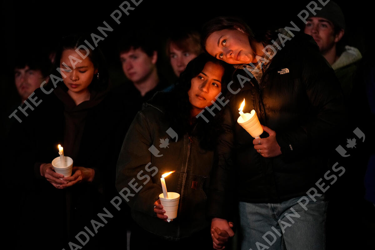 People gather at a vigil for the victims of Wednesday's mass shootings, Sunday, Oct. 29, 2023, outside the Basilica of Saints Peter and Paul in Lewiston, Maine. (AP Photo/Matt Rourke)