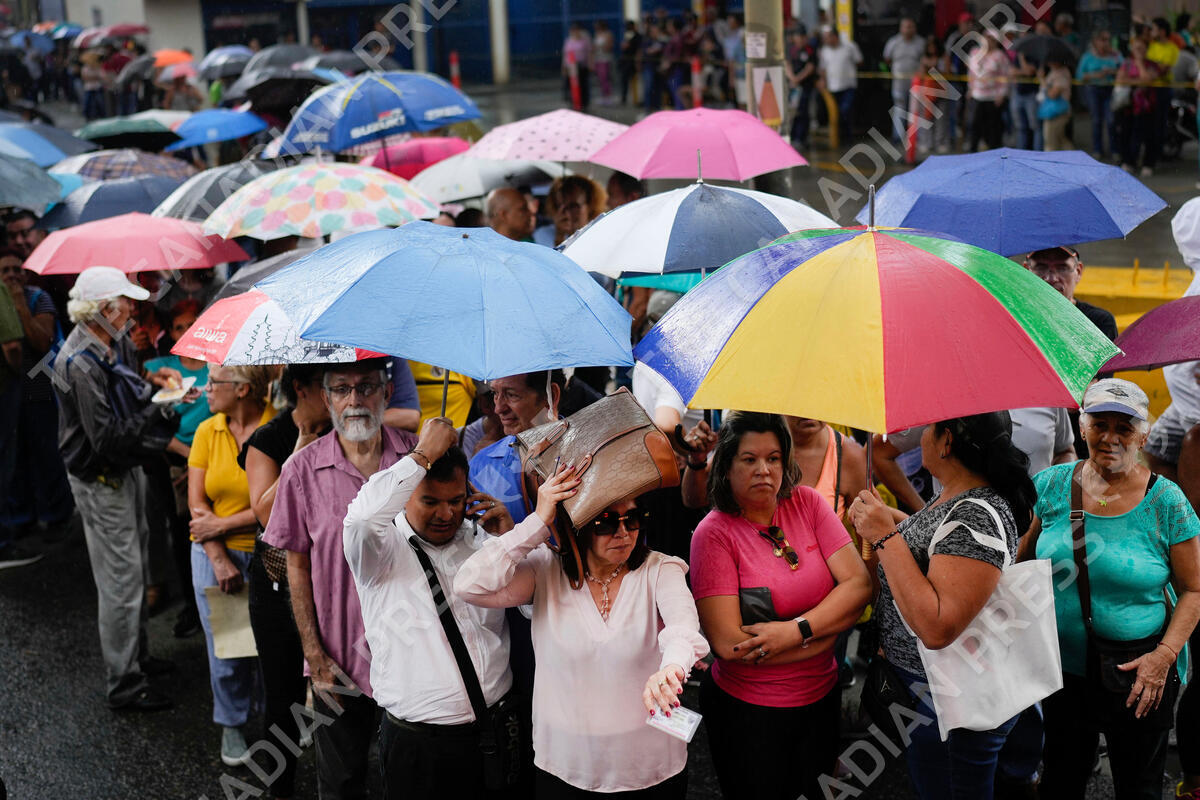 People line up to vote in the opposition primary election that was later denounced as illegal by the government, in Caracas, Venezuela, on a rainy Sunday, Oct. 22, 2023. Organized by the National Primary Commission, the election drew more than 2.4 million voters in Venezuela and abroad and was aimed at choosing a candidate to run against President Nicolás Maduro next year. (AP Photo/Matias Delacroix)