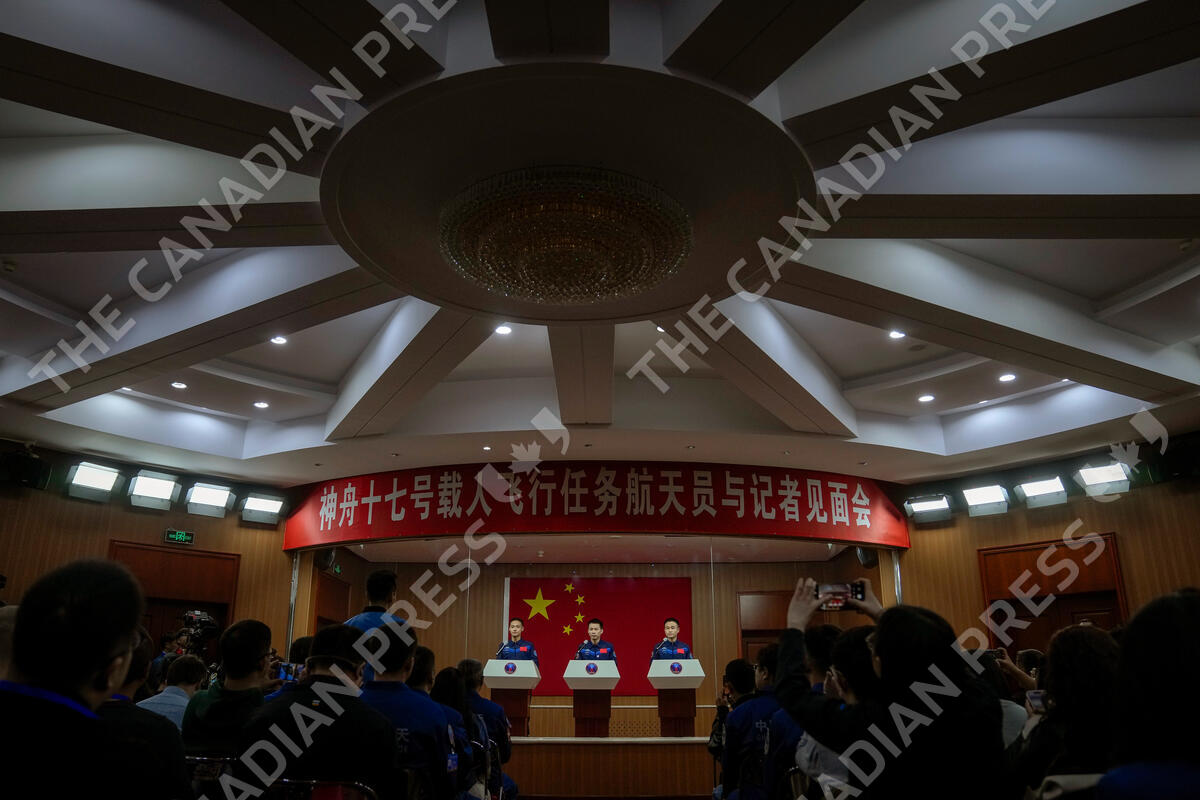 Chinese astronauts for the upcoming Shenzhou-17 mission, from left, Jiang Xinlin, Tang Hongbo and Tang Shengjie take a question from a reporter during a meeting with the press at the Jiuquan Satellite Launch Center in northwest China, Wednesday, Oct. 25, 2023. (AP Photo/Andy Wong)