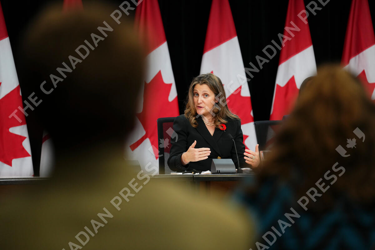 Deputy Prime Minister and Minister of Finance Chrystia Freeland holds a press conference in Ottawa on Tuesday, Oct. 31, 2023. THE CANADIAN PRESS/Sean Kilpatrick