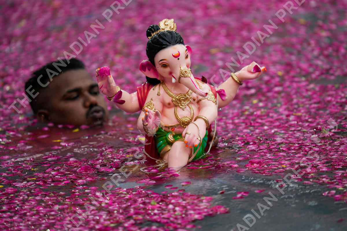 A man prepares to immerse in an artificial pond, an idol of elephant headed Hindu god Ganesha on the second day of ten days long Ganesh Chaturthi festival in Mumbai, India, Wednesday, Sept. 20, 2023. (AP Photo/Rajanish Kakade)