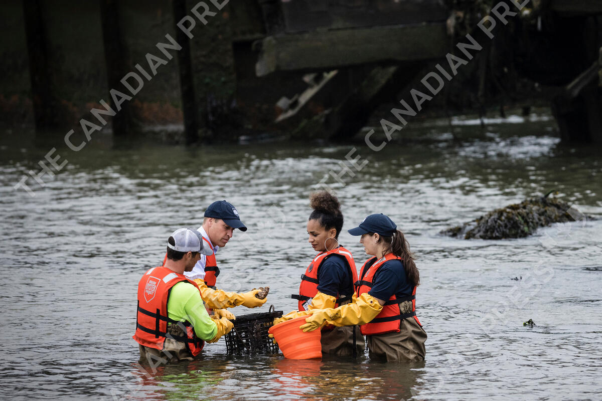 Britain's Prince William examines oyster samples in the East River with students from the Urban Assembly New York Harbor School in New York on Monday, Sept. 18, 2023, during a visit to an oyster reef restoration project. (AP Photo/Stefan Jeremiah, Pool)