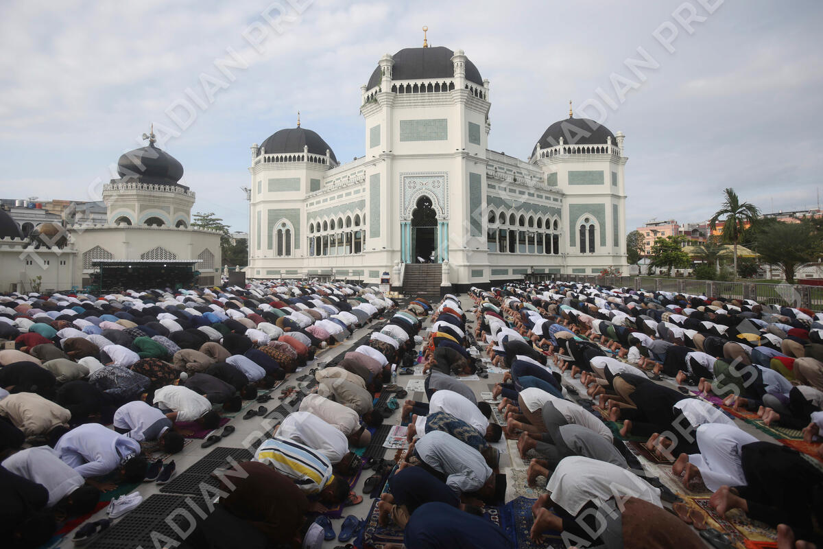 Muslims perform a morning prayer marking the Eid al-Adha holiday in front of Al Mashun Great Mosque in Medan, Indonesia, Thursday, June 29, 2023. Muslims around the world will celebrate Eid al-Adha, or the Feast of the Sacrifice, slaughtering sheep, goats, cows and camels to commemorate Prophet Abraham's readiness to sacrifice his son Ismail on God's command. (AP Photo/Binsar Bakkara)