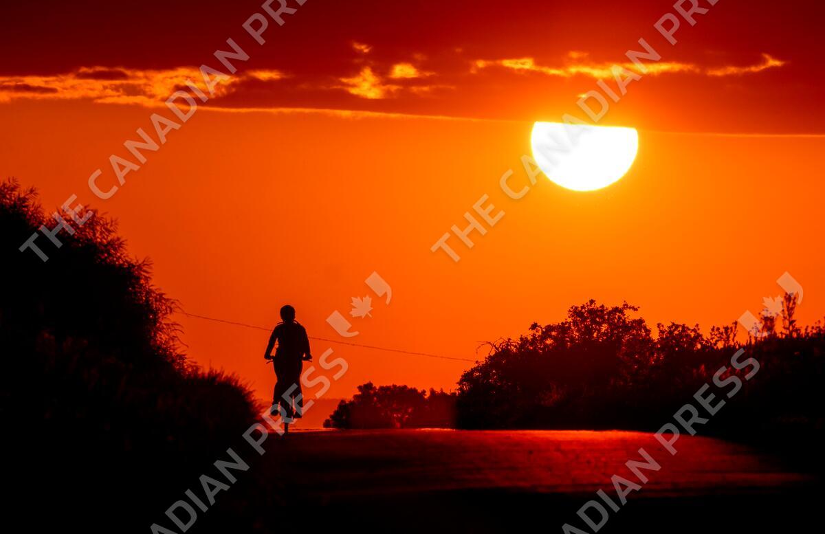 A woman rides her bike on a small road on the outskirts of Frankfurt, Germany, early Wednesday, June 28, 2023. (AP Photo/Michael Probst)
