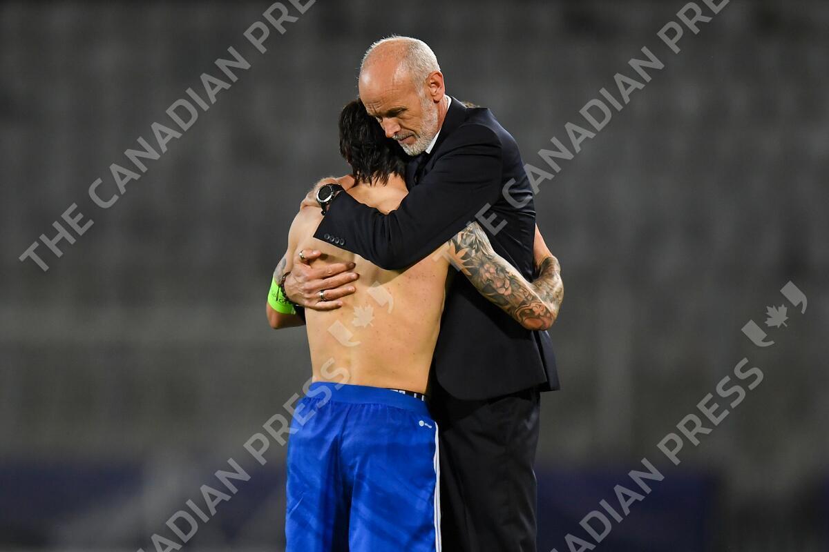 Italy's Sandro Tonali gets a hug from Italy's coach Paolo Nicolato at the end of the Euro 2023 U21 Championship soccer match between Italy and Norway at the Cluj Arena stadium in Cluj, Romania, Wednesday, June 28, 2023.(AP Photo/Raed Krishan)