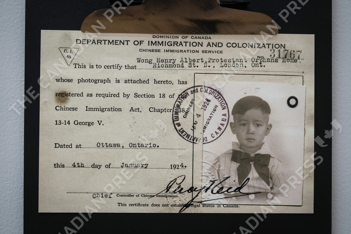 A special identity document called a C.I. certificate that was issued to a Chinese boy named Henry Albert Wong by the Canadian government is displayed at the Chinese Canadian Museum ahead of the official opening, in Vancouver, on Monday, June 26, 2023. The new museum is located in the historic Wing Sang Building, Vancouver Chinatown's oldest building, and opens to the public on July 1. THE CANADIAN PRESS/Darryl Dyck