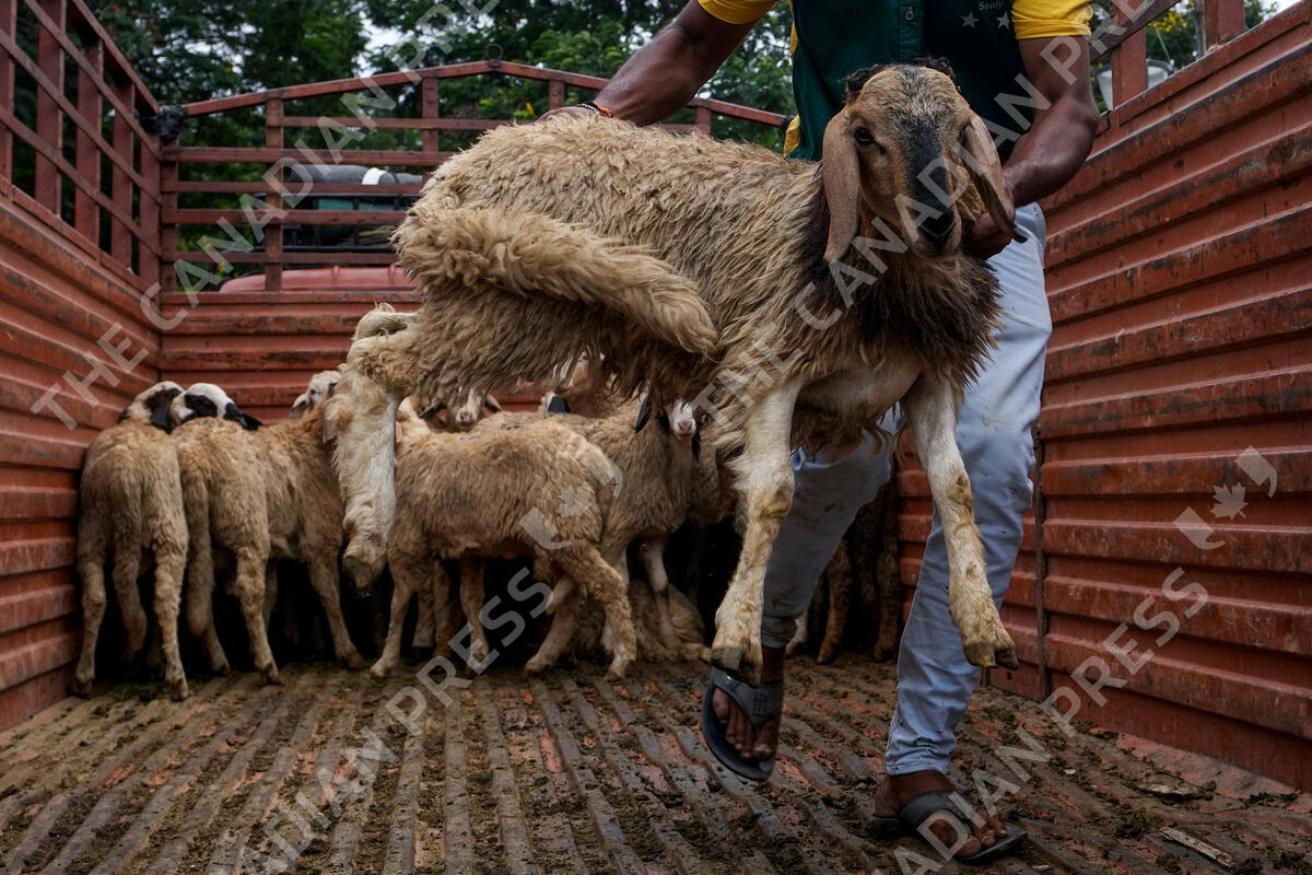 A worker unloads goats from a truck at a temporary roadside shelter ahead of the Muslim festival of Eid al-Adha in Hyderabad, India, Monday, June 26, 2023. Muslims celebrate Eid al-Adha by slaughtering sheep, goats, camels or cows. (AP Photo/Mahesh Kumar A.)