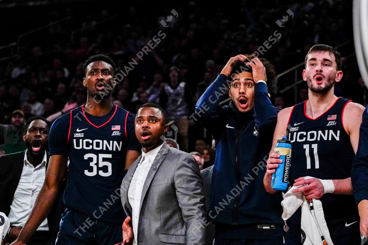 Connecticut players and coaches react to the referee's whistle during the first half of an NCAA college basketball game against Texas in the final of the Empire Classic tournament in New York, Monday, Nov. 20, 2023. (AP Photo/Peter K. Afriyie)