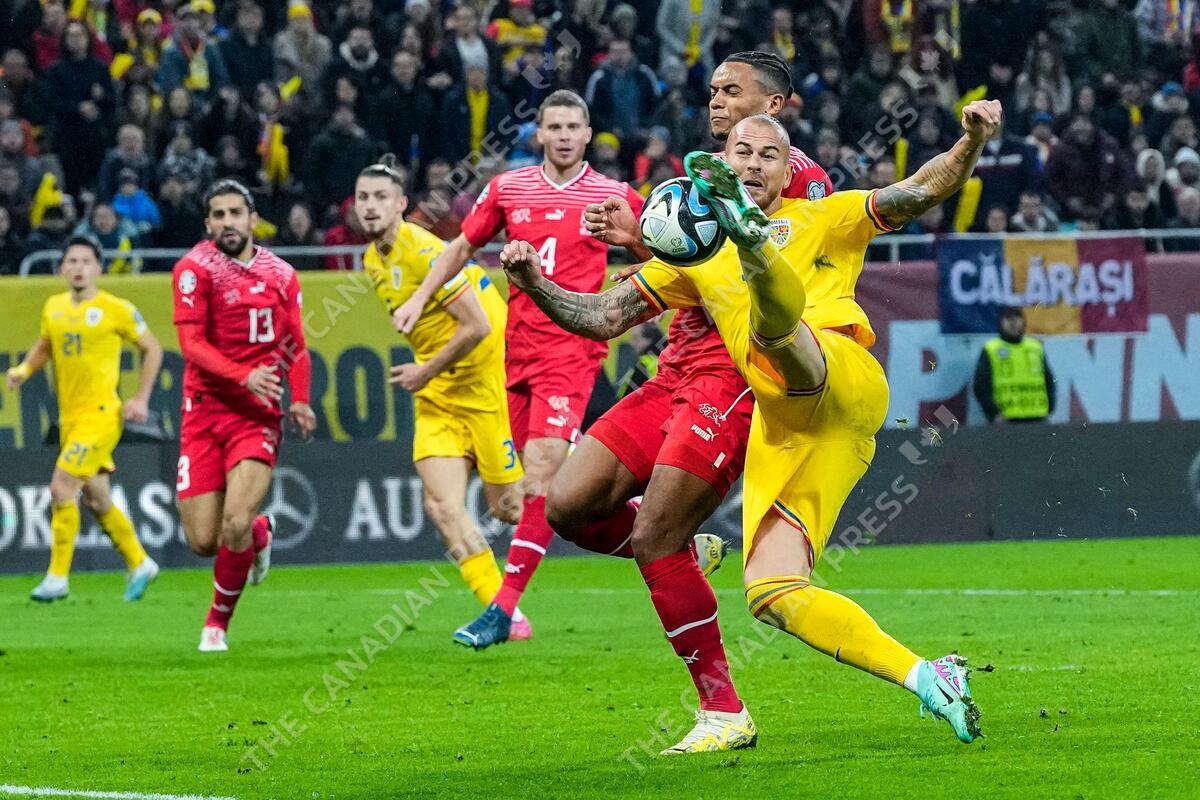 Romania's Denis Alibec takes a shot at goal during the Euro 2024, group I, qualifying soccer match between Romania and Switzerland at the National Arena stadium in Bucharest, Romania, Tuesday, Nov. 21, 2023.(AP Photo/Andreea Alexandru)