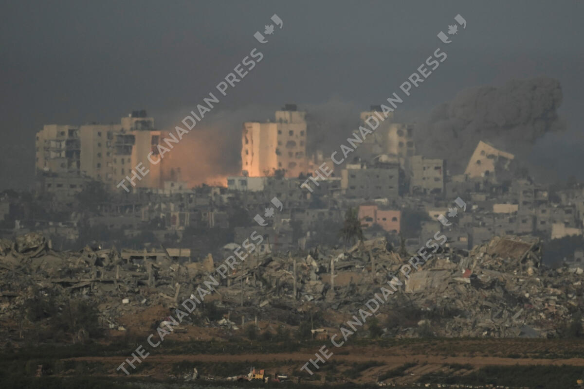 An explosion is seen following an Israeli airstrike in the Gaza Strip, as seen from southern Israel, Thursday, Nov. 23, 2023. (AP Photo/Leo Correa)