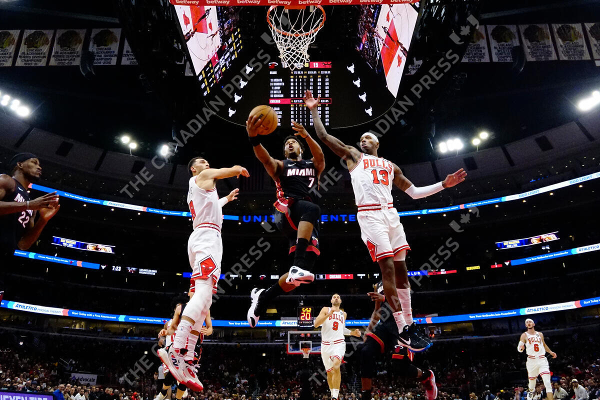 Chicago Bulls guard Zach LaVine, left and forward Torrey Craig, right, defend Miami Heat guard Kyle Lowry (7) battle during the first half of an NBA basketball game, Monday, Nov. 20, 2023, in Chicago. (AP Photo/David Banks)