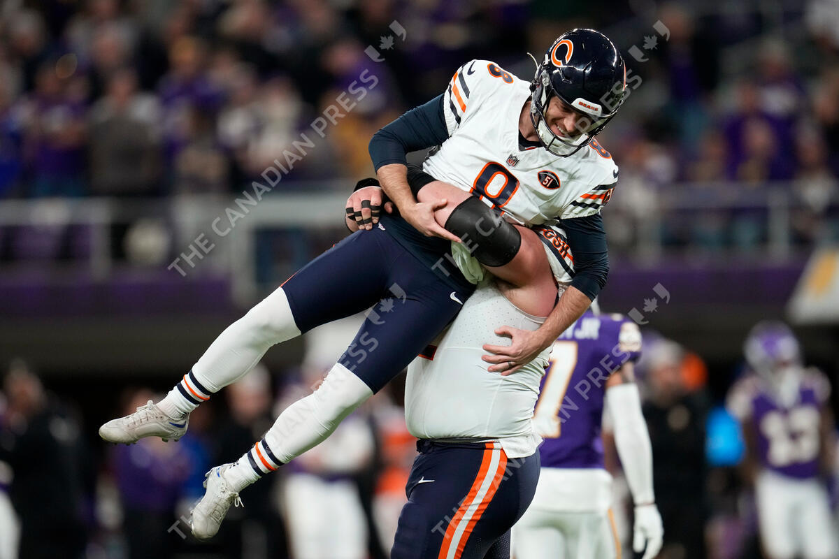 Chicago Bears place-kicker Cairo Santos (8) celebrates with teammate guard Lucas Patrick after kicking a 30-yard field goal during the second half of an NFL football game against the Minnesota Vikings, Monday, Nov. 27, 2023, in Minneapolis. The Bears won 12-10. (AP Photo/Abbie Parr)