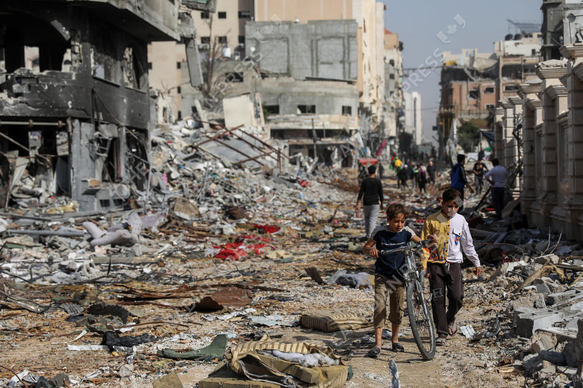 Palestinians walk through destruction in Gaza City on Friday, Nov. 24, 2023, as the temporary ceasefire between Israel and Hamas took effect. (AP Photo/Mohammed Hajjar)