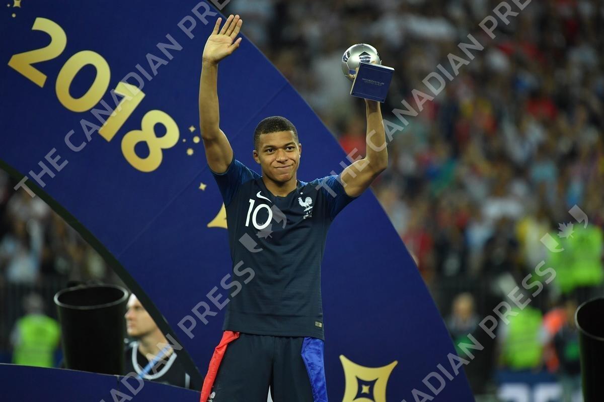 France's Kylian Mbappe lifts the World Cup’s best young player trophy after winning 4-2 the 2018 FIFA World cup final football match France v Croatia at Luzhniki stadium in Moscow, Russia on July 15, 2018. Photo by Lionel Hahn/ABACAPRESS.COM