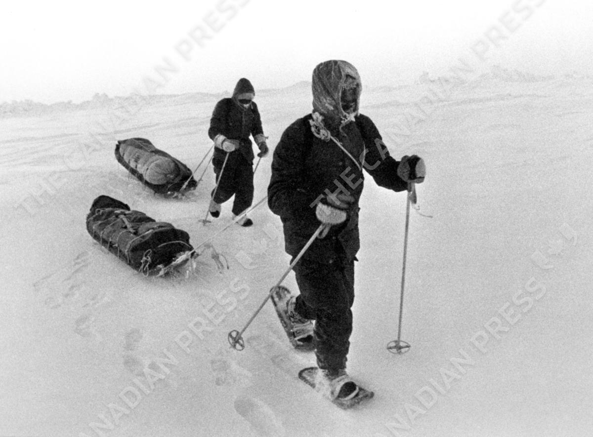 Sir Ranulph Fiennes (l) and Charles Burton (r) trekking across the Arctic wastes on their way to the North Pole. At this point the two explorers were facing a critical situation as the ice around them was melting as well as their back-up aircraft currently grounded. They reached the North Pole on 11th April to become the first people to do so in one season.