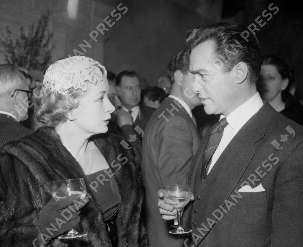 Actor Richard Todd, who portrayed Wing Commander Guy Gibson in 'The Dambusters' film, in conversation with Mrs G. Gibson, widow of Wing Commander Gibson, during a reception at the Royal Air Force Association headquarters in Portland Place, London. The Duchess of Gloucester attended the reception and received cheques for over £20,000, representing collections taken in cinema foyers during the showing of 'The Dambusters'. The money will be devoted to the welfare work of the Association and RAF personnel.