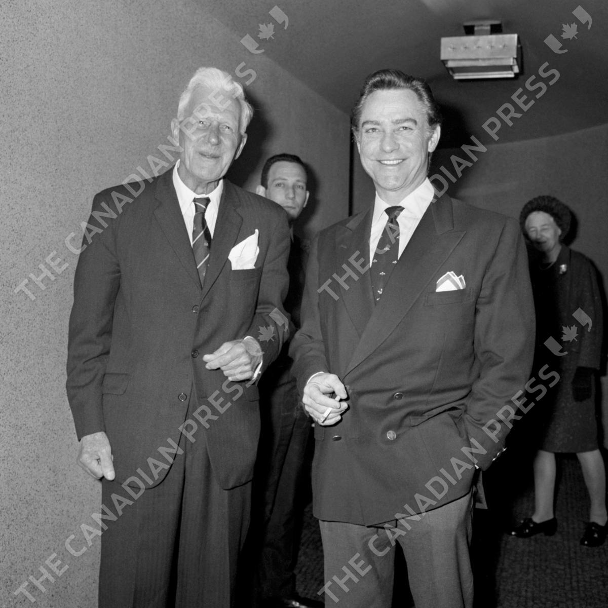 Dr Barnes Wallis, the man whose faith in the low-level 'bouncing' bomb was a key factor in the success of the historic raid by the Dam Busters on the Moehne Dam in the Second World War, in London during a reunion of members of the famous Dambusters squadron. He is speaking to Richard Todd, right, who starred in "The Dam Busters" film as Wing Commander Guy Gibson, at the Warner Theatre, Leicester Square, where a special screening of the film was part of the Dam Buster weekend reunion.
