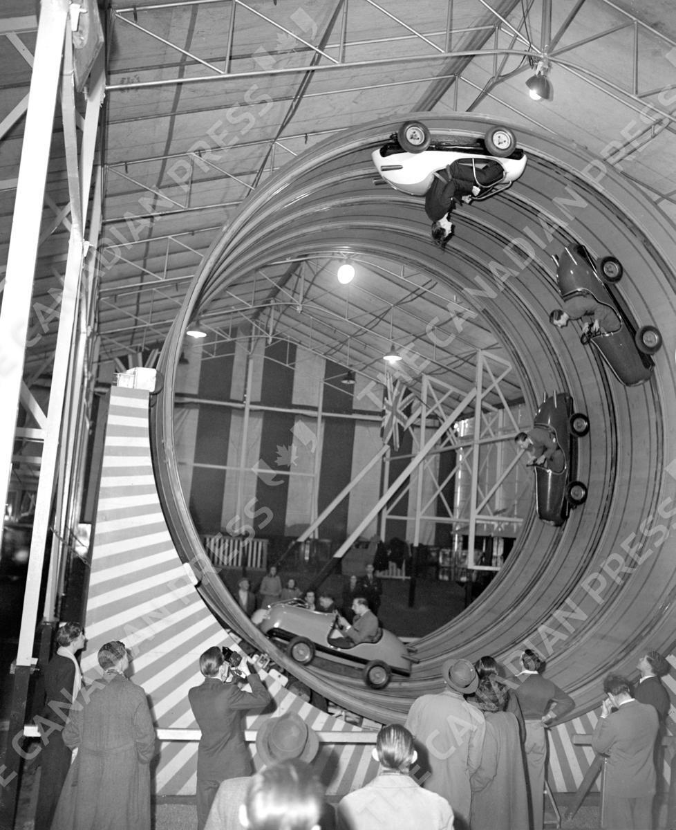 Visitors to the Festival of Britain get a thrill in these speedy cars as they loop the loop