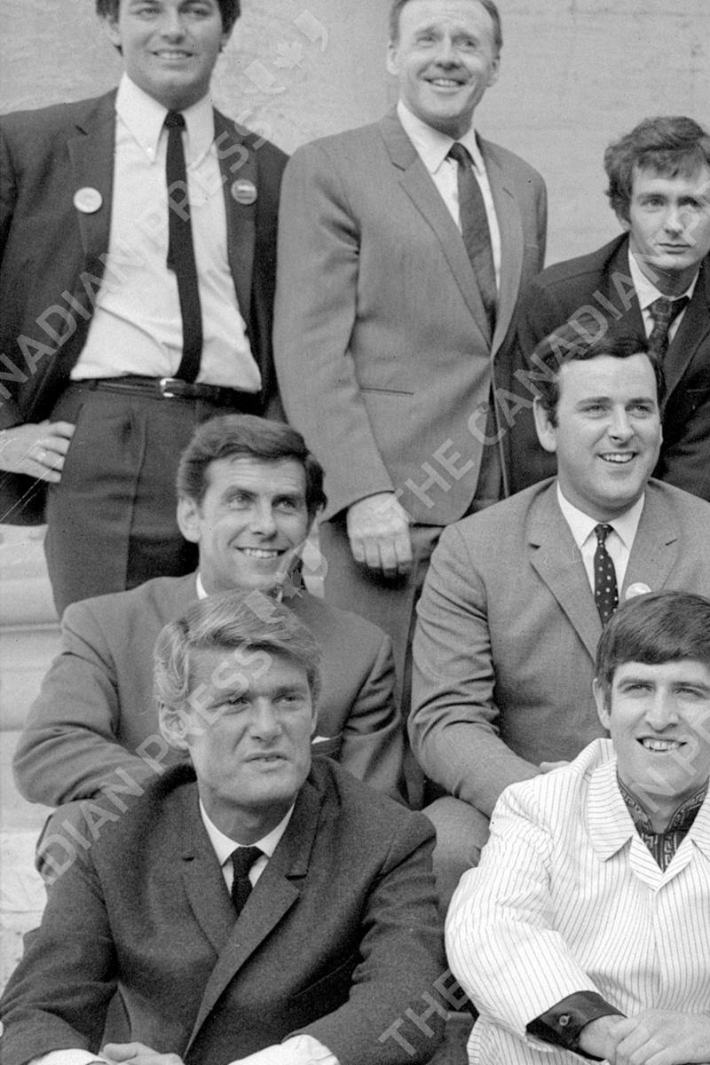 Bob Holness, centre left, sitting next to Terry Wogan, two of the disc jockeys for the BBC's new Radio 1 (Pop) and Radio 2 (Light) radio network, at Broadcasting House, Portland Place, London. On the back row are Tony Blackburn, Jimmy Young, and Kenny Everett, and sitting in front of Holness and Wogan are Pete Murray and Ed Stewart.
