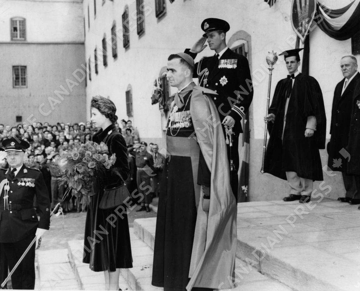 Princess Elizabeth and the Duke of Edinburgh on the steps of Laval University as they hear the English and French rendition of "God Save the King". Archbishop Roy, Roman Catholic prelate is seen with them.