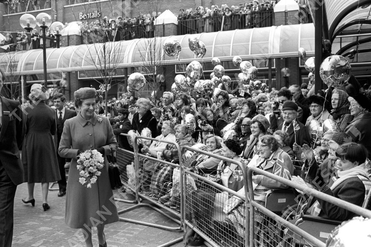 Queen Elizabeth II opening the Ealing Broadway Centre. Behind her, background, is Chief Superintendent Jim Beaton, the Queen's Police Officer.