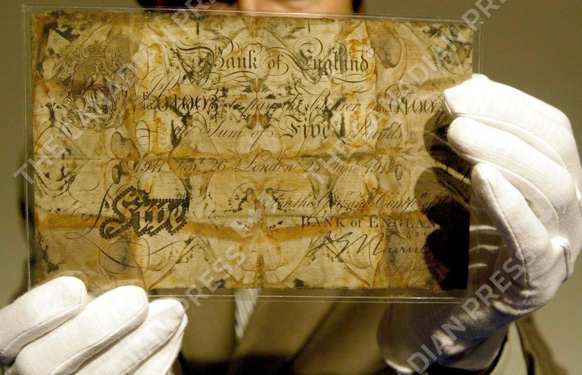 A five pound note, recovered from the wreck of the Titanic is shown to members of the press ahead of the start of the Titanic-The Artifact exhibition at the Museum of Science and Industry in Manchester.