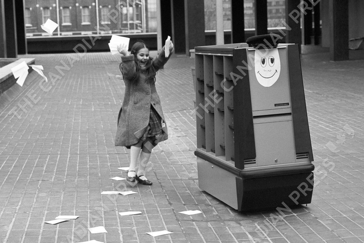 The world's first robot postman travels around the Cunard Hotel, West London, where the robot it to make it's debut at the Info '81 exhibition. The smiling faced robot has found a friend in 10 year old Lisa Medalyer