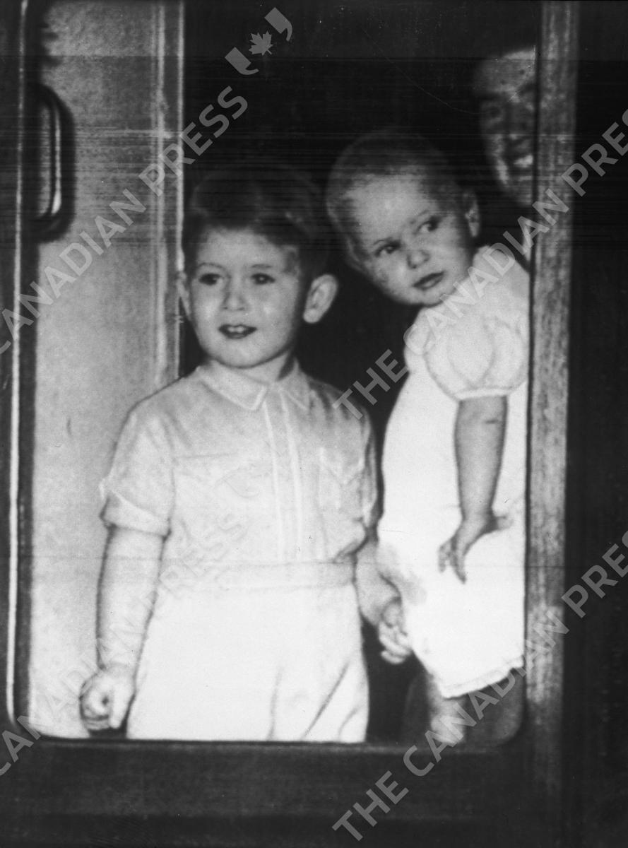 Princess Anne takes a peep round the carriage door of the Royal train with her brother, Prince Charles, as it stops at Aberdeen station en route to Ballister.