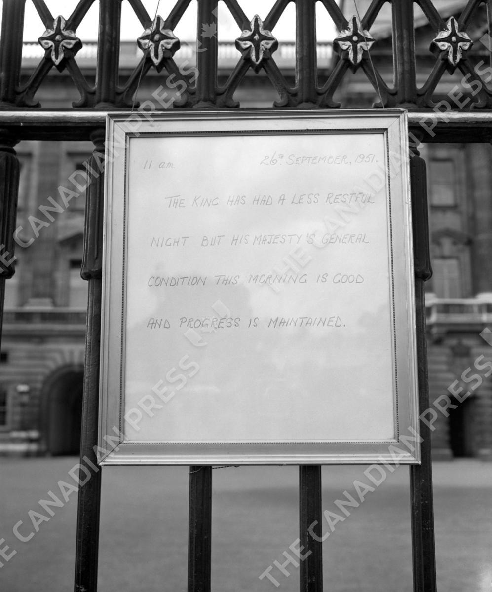 The latest bulletin about King George VI's condition following his lung operation posted on the railings of Buckingham Palace. The Bulletin said: "The King has had a less restful night, but his Majesty's general condition this morning is good and progress is maintained"."