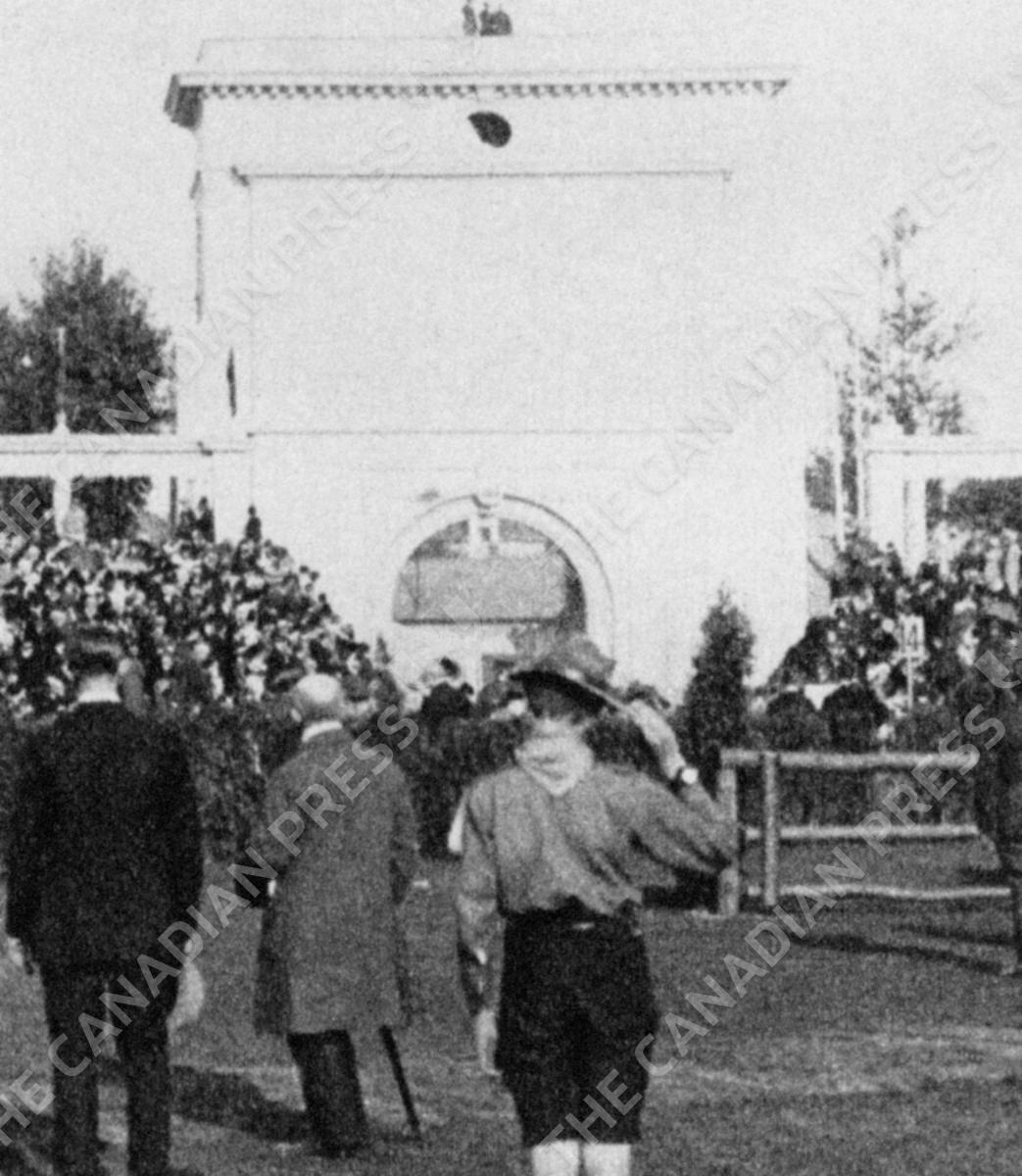 A Belgian Boy Scout, one of many Boy Scout volunteers at the Antwerp Games, salutes the Swedish Flag at the culmination of the Team Eventing competition, won by the Swedish team.