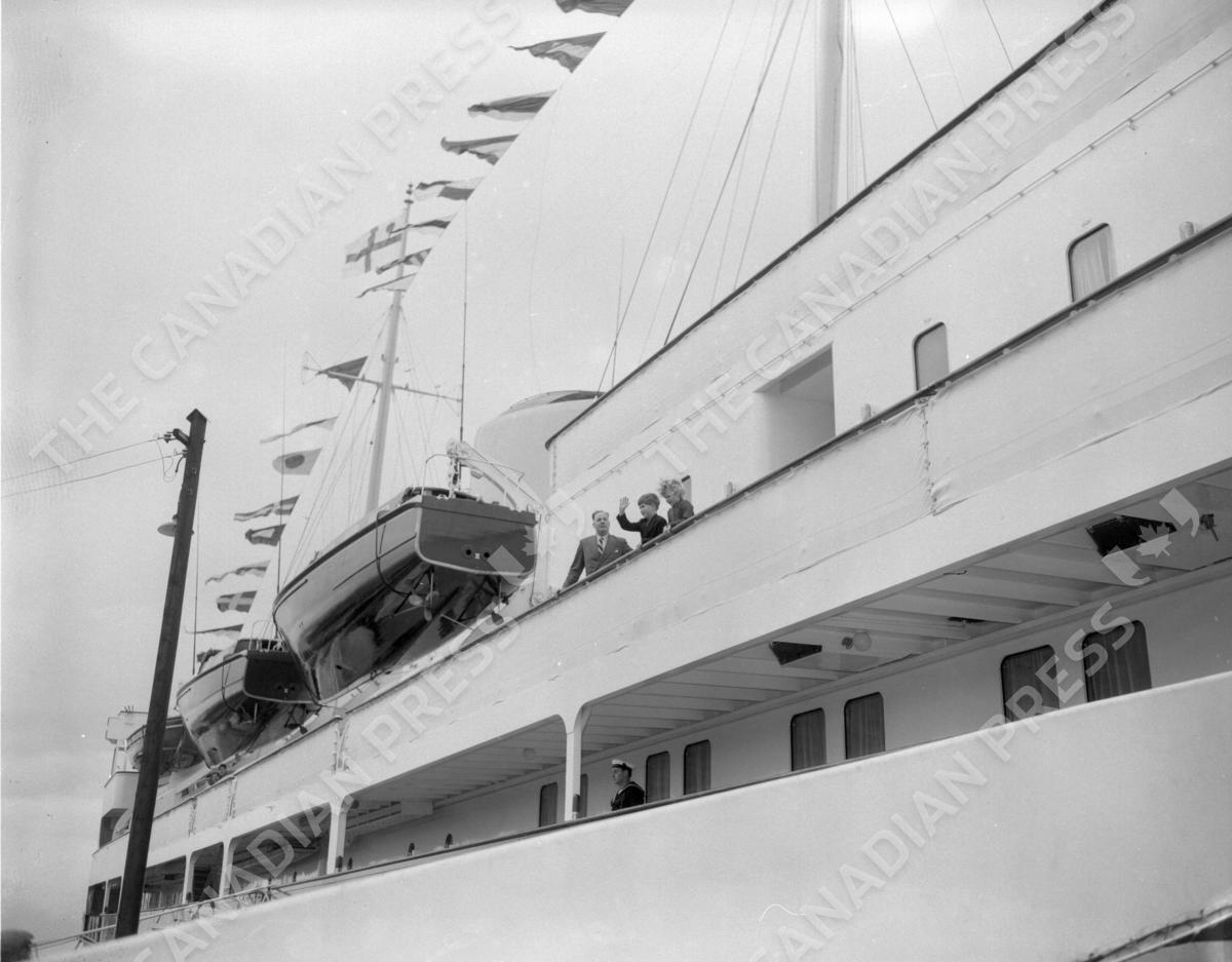 Princess Anne, with her brother Prince Charles, as he waves to the crowd on the quayside at Barrow-in-Furness from the Royal Yacht Britannia. The children were being joined on the Britannia by the Queen and Duke of Edinburgh for a holiday cruise to the Western Isles of Scotland.
