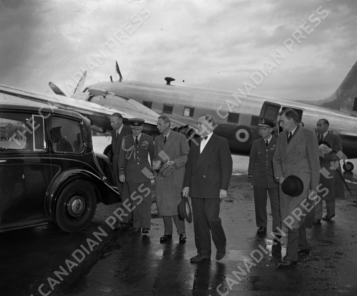 King George VI arriving at Heathrow Airport after flying from Dyce Airport, Aberdeen, in a Viking Aircraft of the King's Flight. The King had curtailed his holiday at Balmoral to return to London for further treatment on his lung condition.