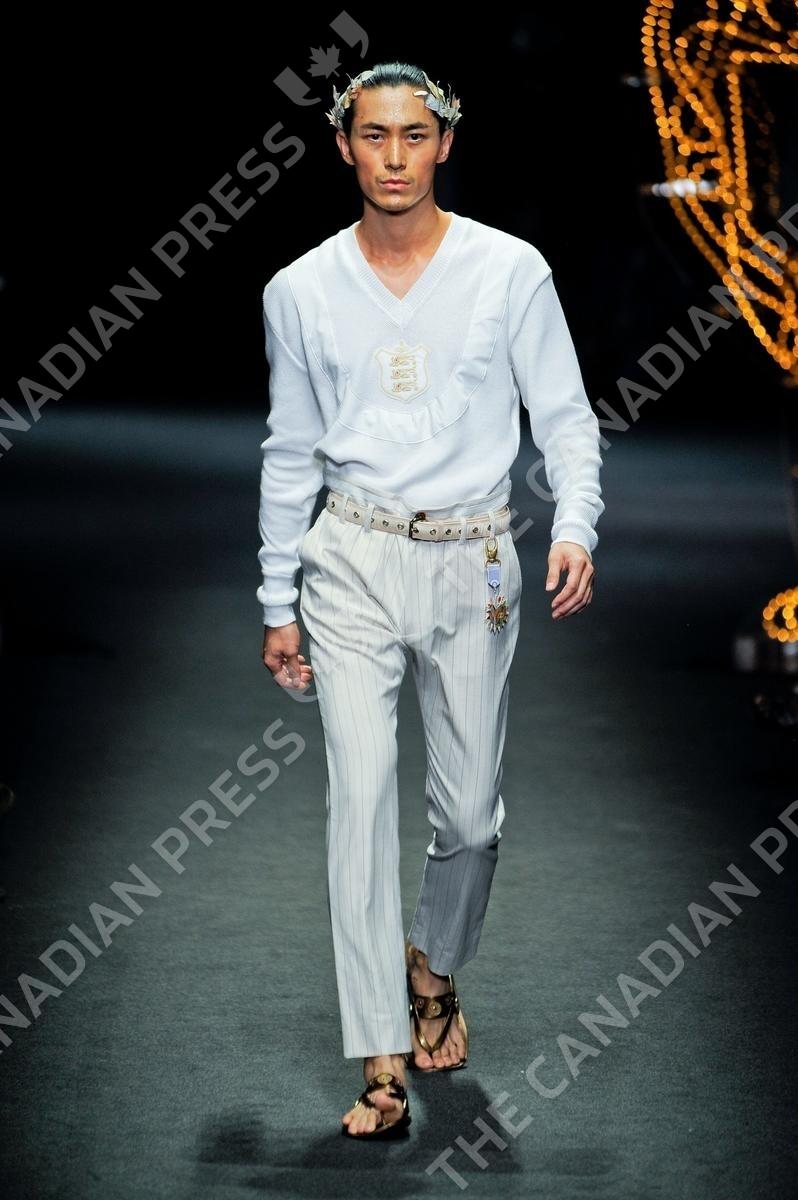 A model on the catwalk during the Vivienne Westwood show at Milan Fashion Week, Men Spring Summer 2012 in Italy