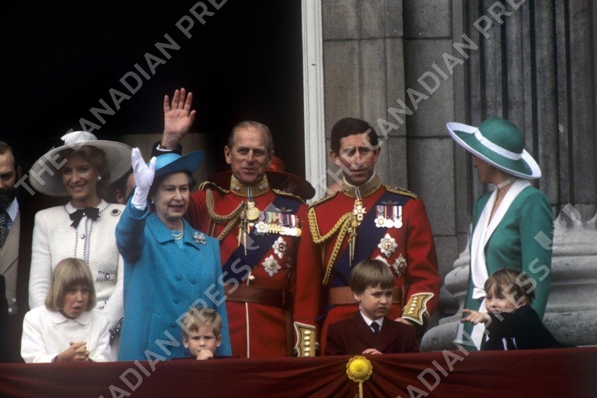 Left to right; Princess Michael of Kent with her daughter Lady Gabriella Windsor, the Queen, Duke of Edinburgh, Prince of Wales, and Princess of Wales. Foreground; Prince Harry, Prince William and the Earl of Ulster.