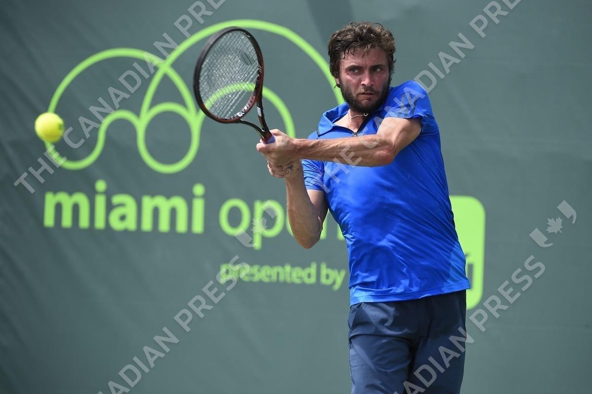 Gilles Simon of France during his first round match at the Miami Open presented by Itau at Crandon Park Tennis Center in Key Biscayne, Miami, FL, USA on March 25, 2016. Photo by Corinne Dubreuil/ABACAPRESS.COM