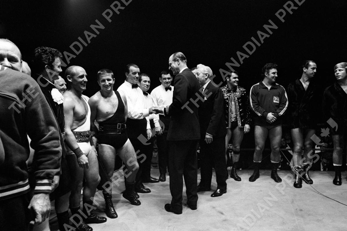 The Duke of Edinburgh meeting the wrestlers in the ring when he saw professional wrestling for only the second time, as guest of honour at a fund raising show in aid of the St John's Ambulance Association and Brigade.
