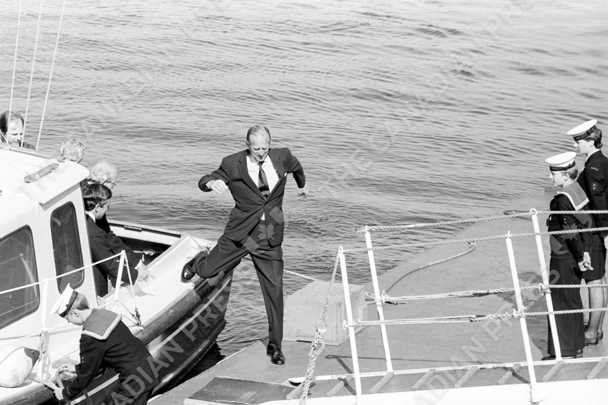 The Duke of Edinburgh jumps ashore from the Royal Forth Yacht Club vessel "The Royal Forth" after a tour of Granton Harbour, Edinburgh.