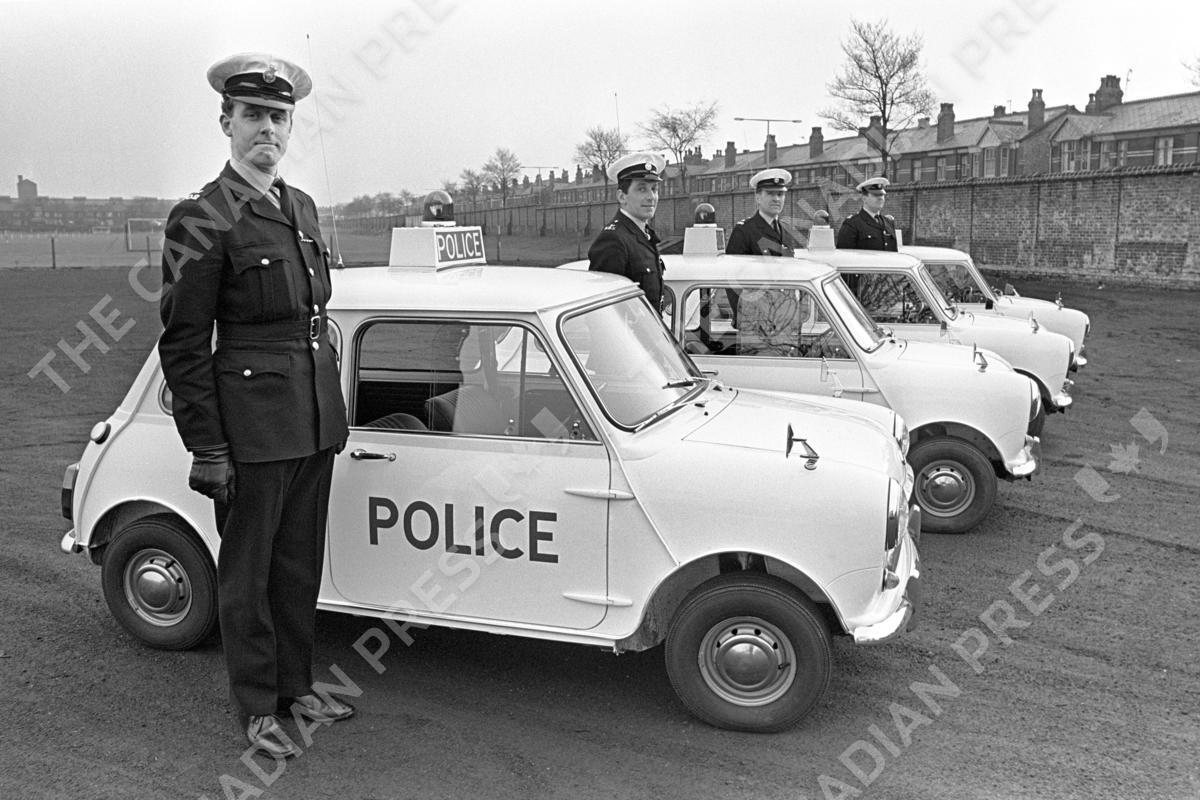 Manchester City police traffic officers with their latest cars, the 100mph plus Mini Cooper S. The minis were chosen for their maneuverability as well as their speed