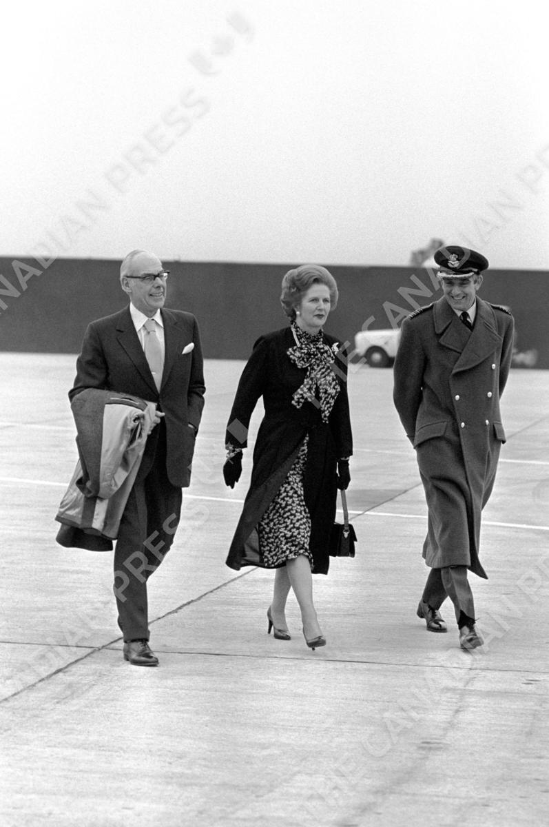 Premier Margaret Thatcher, accompanied by her husband Denis, at Heathrow airport, London prior to flying out to Washington, DC for her historic meeting with President Reagan.